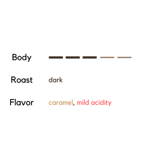 This dark roast has a robust flavor and full-bodied palette. The mild acidity of the blend is balanced by the pleasantly sweet flavors of caramel to create a rich and complex cup of coffee.